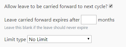 - If the Allow leave to be carried forward to next cycle? checkbox is set, there will now be an additional line that appears under it.